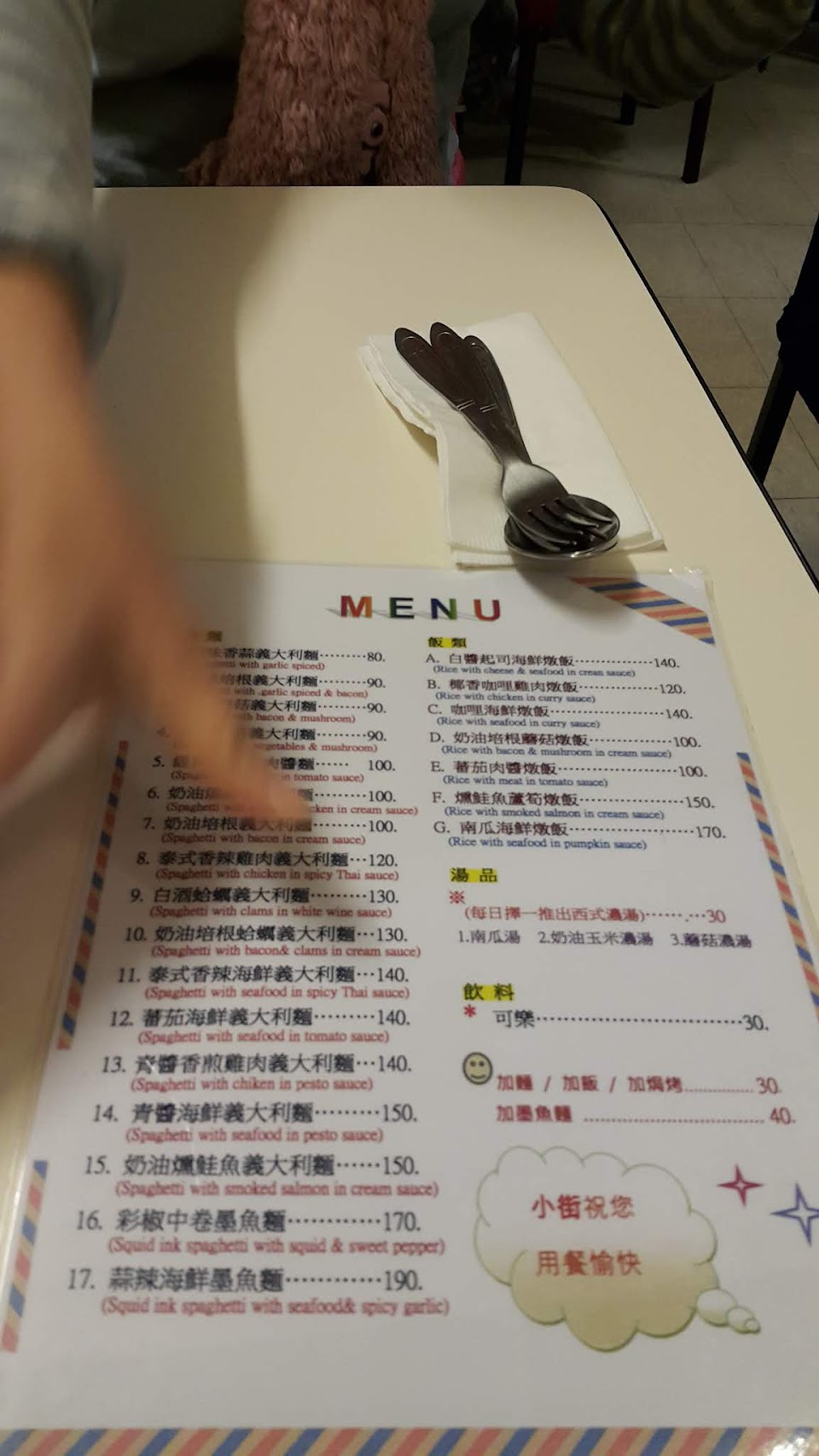 今天去吃,口味不錯,點了白醬起司海鮮燉飯、奶油培根義大利麵、明太子啵啵義大利麵、玉米濃湯,下次有機會再去光顧