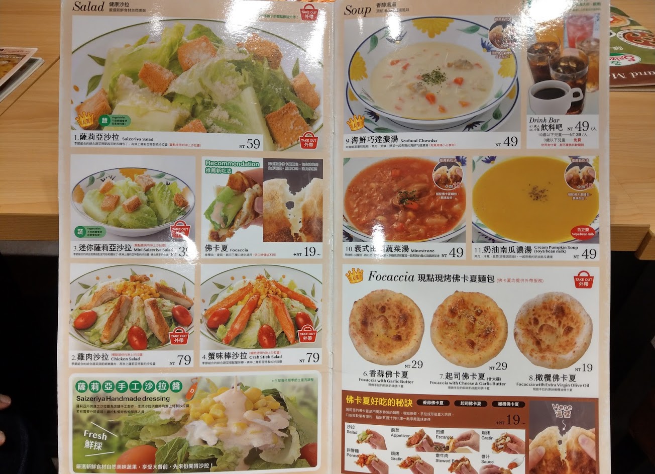 我是喜歡薩莉亞,但是桃園分店卻讓我非常失望,我點了奶油燻鮭魚義大利麵,麵非常乾,並不好吃;我朋友點了青醬海瓜子義大利麵,卻很油,品質控管似乎相當不一;湯品部分也是,讓人喝不出該有的南瓜味,我不確定是那天假日人多所以有疏漏或是桃園分店本就如此,但這樣真的會讓第一次吃到薩莉亞的人嚇到,並從此不會再來,但其實如果在他們有管控好品質,或是去其他分店吃的話,我想還是能算好的體驗