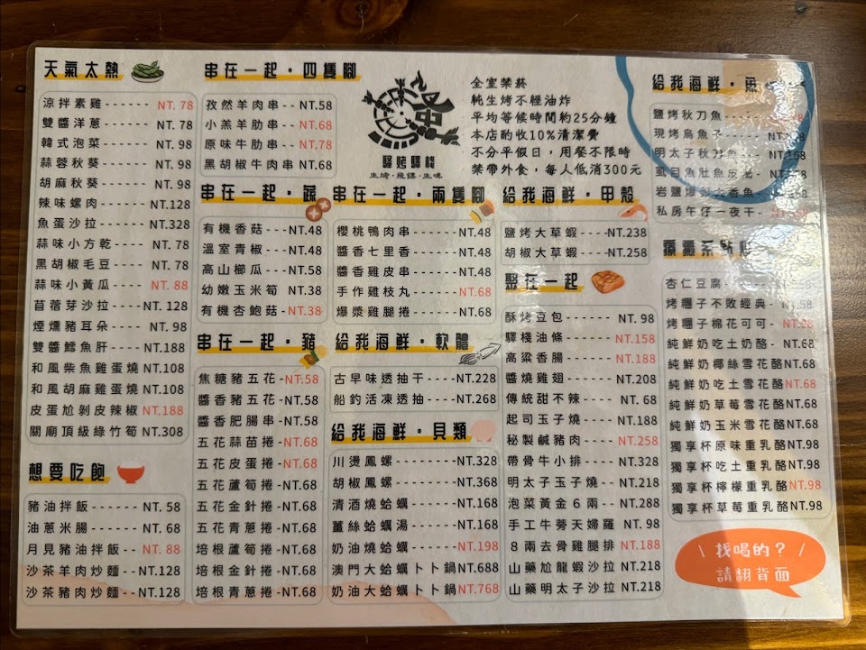必須給五星好評~烤蘆筍五花肉。焦糖豬五花。香腸。甜不辣。雞皮。節瓜烤的超好。咬下去水嫩嫩。真的每個都超厲害的。真的烤功一流。老闆娘服務也很好?真的打趴中壢一堆燒烤店。拜託一定要來嚐看看