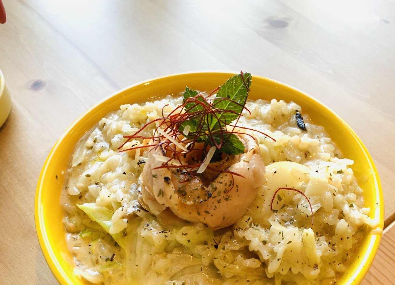 環境很悠閒,停車可於附近鄉間小路旁,座落於田園邊與竹林,坐在店裡很放鬆,店員也很親切、貼心,服務超過100分,店內還有隻溫和可愛的柴犬,店還有販售牛嘎糖、菊花,餐點份量適中,但對於男生可能偏少,海鮮燉飯很好吃有佛卡夏香味,小花枝也好吃重點是蝦子有播殼,另一個是鹹酥雞有排骨酥的香味雖然份量偏少但很好吃,,辣牛肉義大利麵屬於清炒香味夠、牛肉好吃,飲料、甜點部分中規中矩,阿朵法甜點是香草冰淇淋加上義式咖啡,味道酸甜,個人頗喜歡,很棒的消費,下次還會來,附近有波斯菊田天氣不錯可以走走看看。