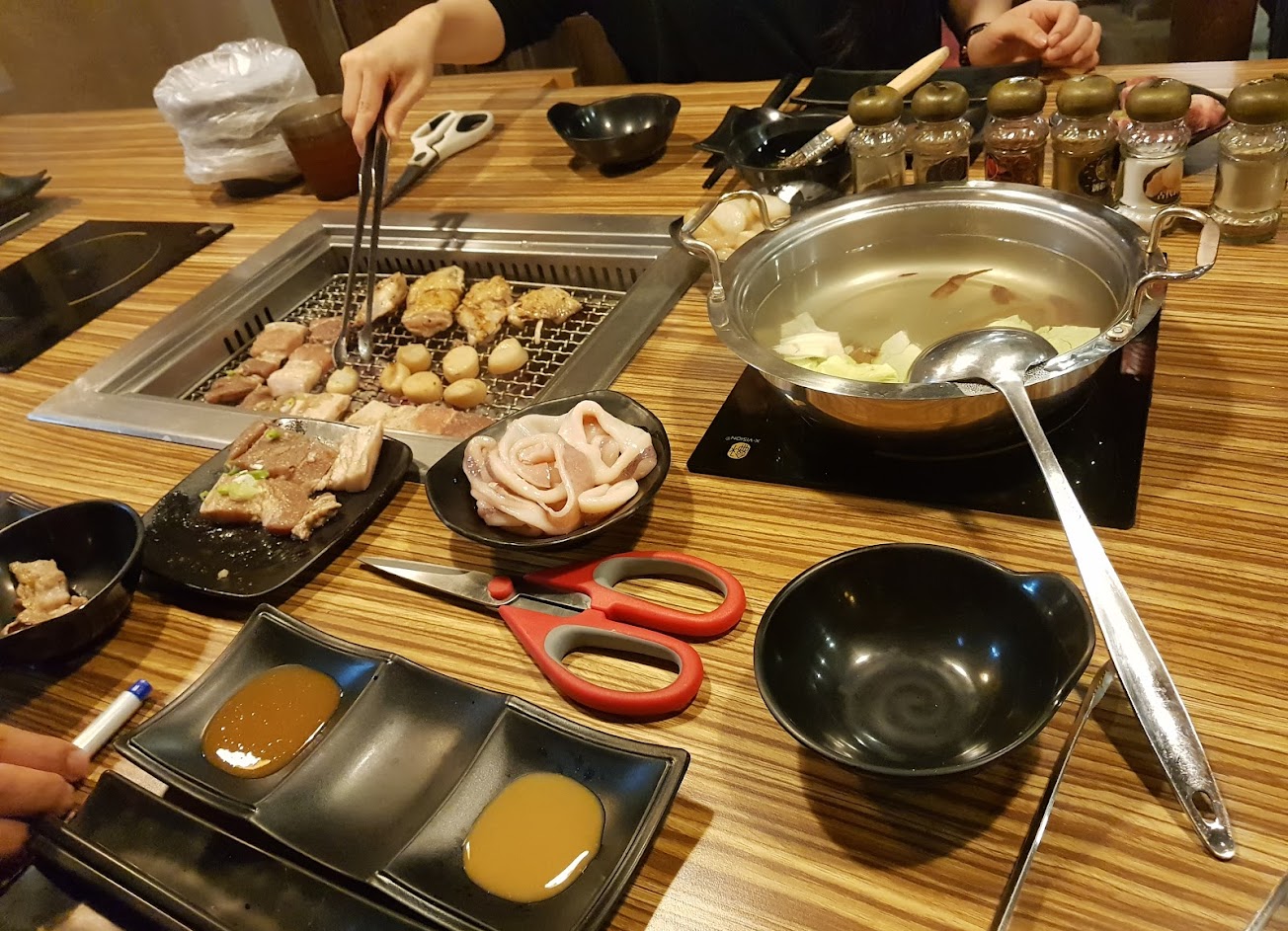 桌面上同時有烤網和火鍋,我們吃飽後店員有推薦我們加蛤蜊進去煮來喝,湯的味道變得更鮮甜更好喝。