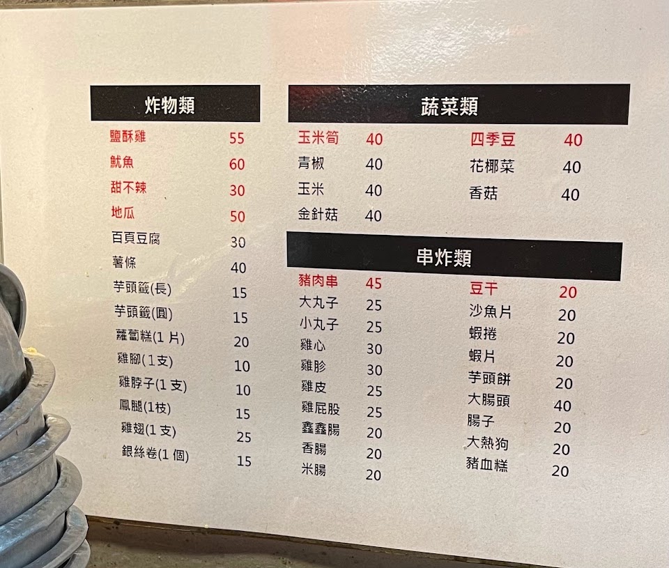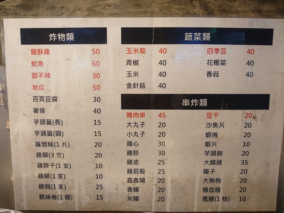 米血20米腸20魷魚60鹹酥雞50豆干20甜不辣30豬肉串45都很好吃!