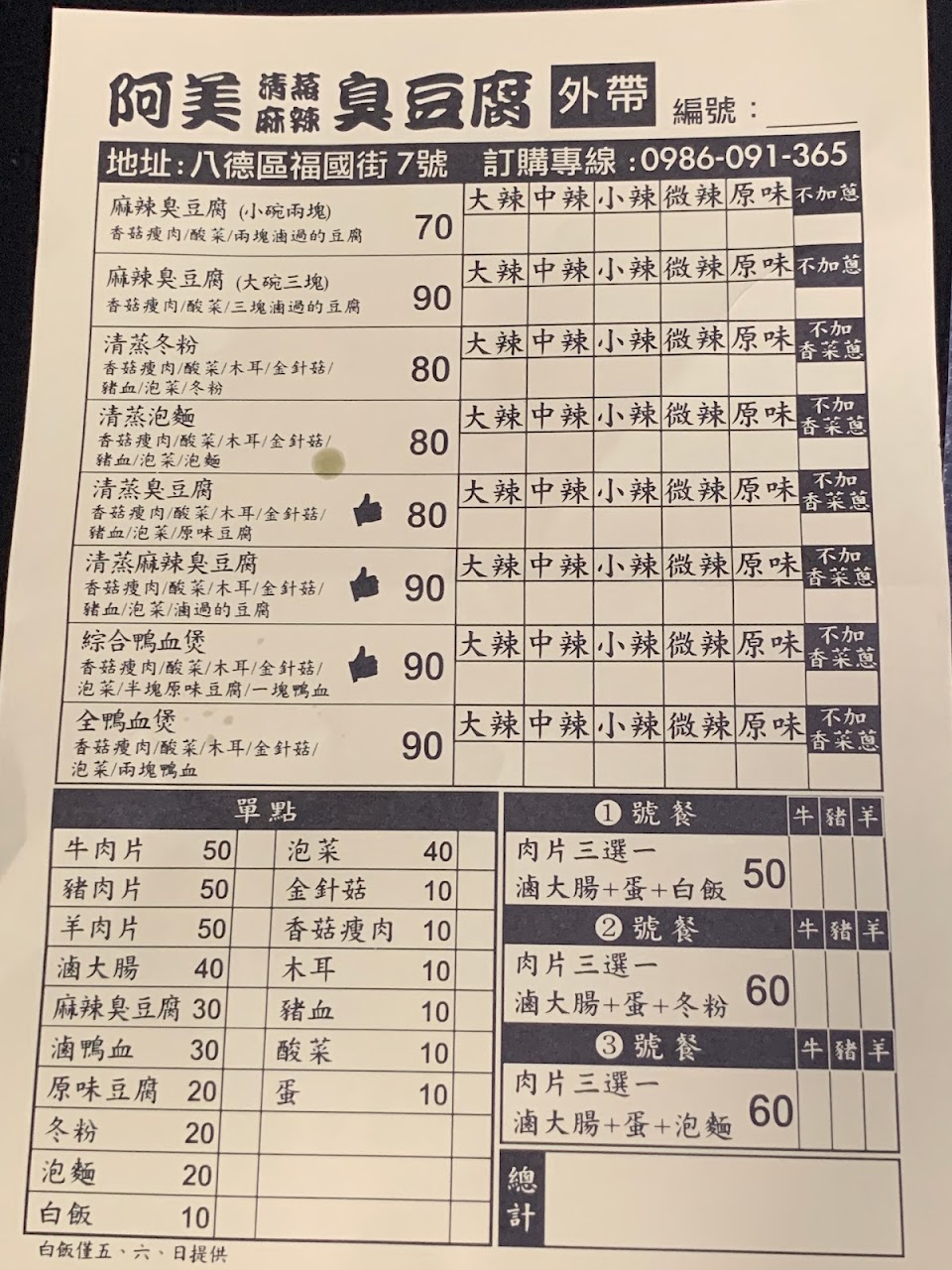 從以前小攤車吃到現在 菜單很貼心如果不加香菜蔥有欄位可以選擇 最愛清蒸臭豆腐微辣 夠臭夠香夠入味 有時候會加錢多加泡菜跟香菇瘦肉 如果要主食要自己單點麵或飯哦!!