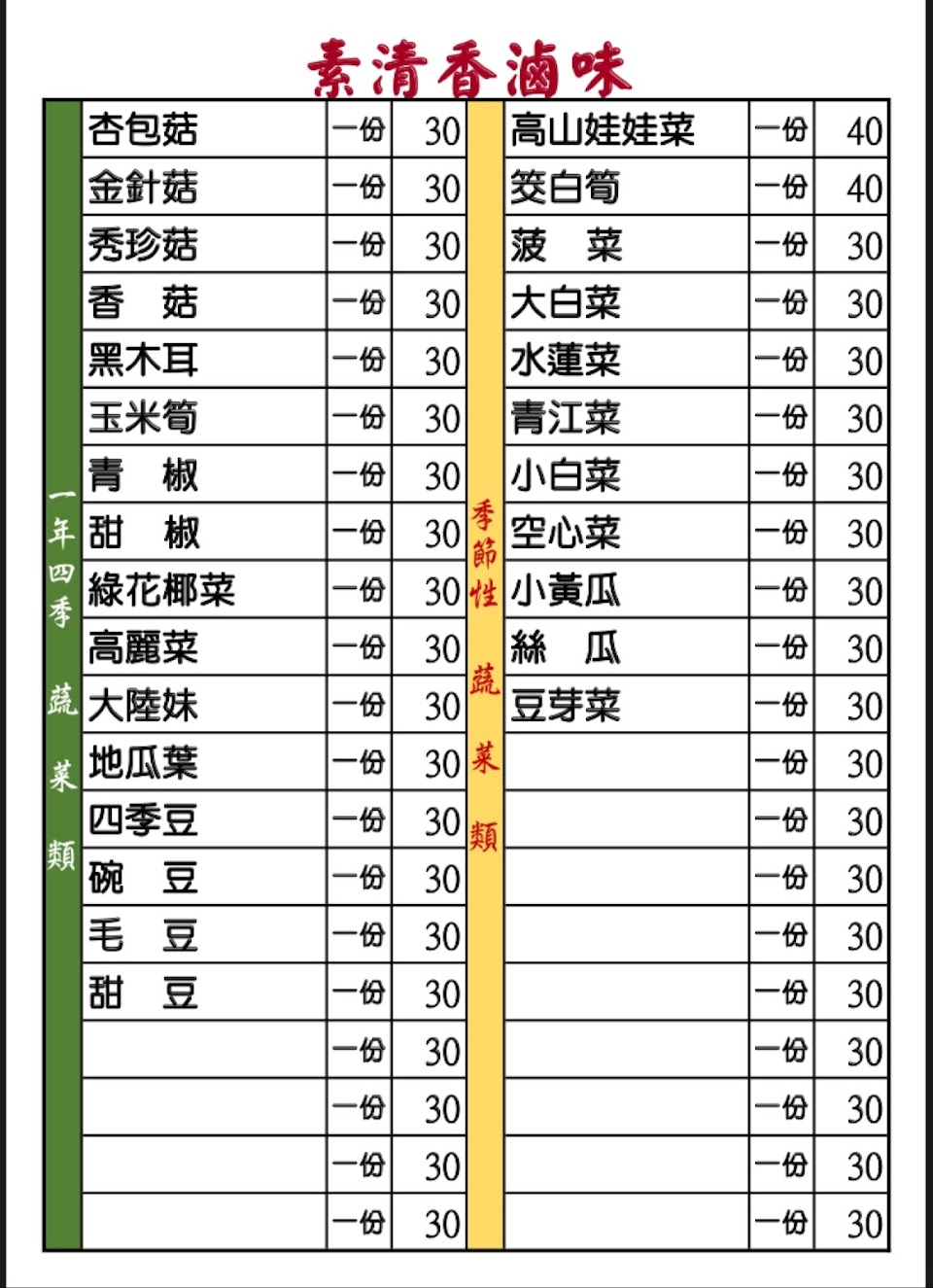 素食炸物與素食滷味,滷味單點低消50元,青菜一份30元,很容易就湊到低消,店家也有提供一份65元的滷味SET,他會提供數樣菜,每種都一點點。