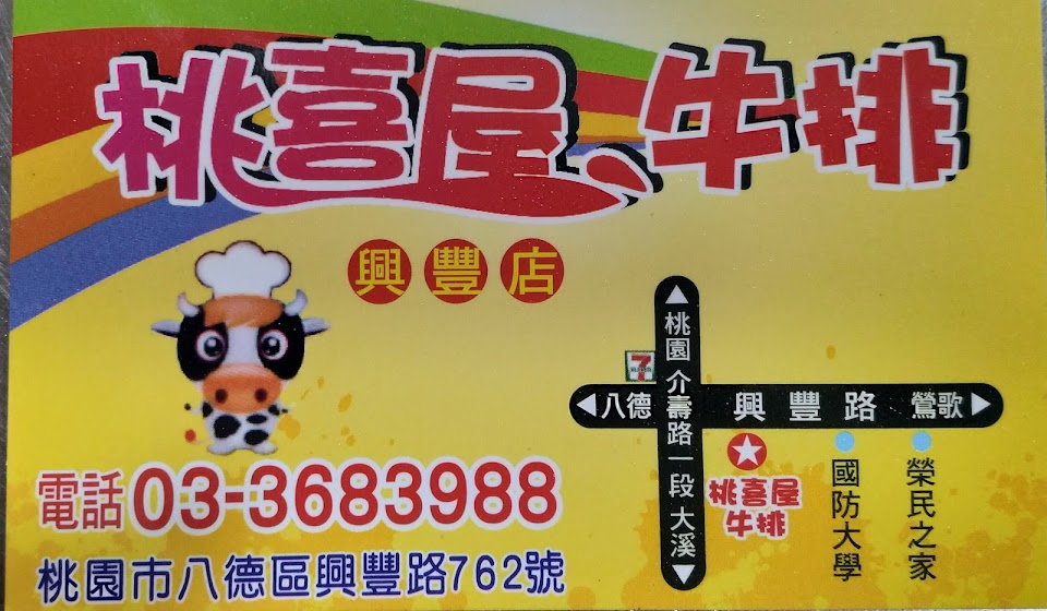 偶然發現了位於八德興豐路上的「桃喜屋牛排」,就在「嫂子拌麵」的隔壁,外觀與環境真的很低調;鐵板麵的份量是便當盒裝滿滿、還加一顆荷包蛋;我們每次都點嫩煎菲力和厚片沙朗,肉量不僅份量超多、口感也很香嫩,價格也只有夜市牛排價格,推薦給大家。