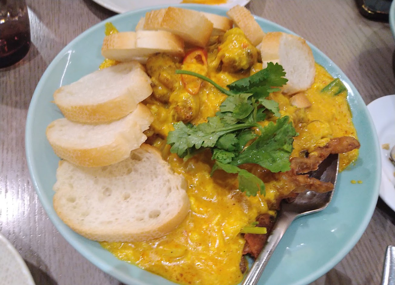 「黃咖哩軟殼蟹」,將近500的價錢,雖然這種東西本來就很貴。吃起來偏鹹但這正常,為了配麵包,也還可以配飯吃,讓人吃了非常的滿足