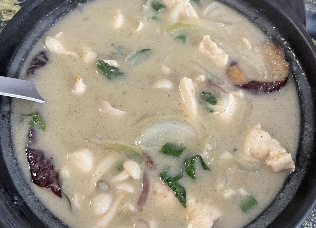 **泰式豆腐煲:是賣場那種盒裝豆腐,沒有煎過,整盒切完就直接放進咖哩,少了一些香氣,很可惜。裡頭的四季豆段沒有太熟,是大忌。四季豆未充分加熱是會引起腸胃道中毒症狀的,希望店家要更注意。此煲的咖哩香氣比泰式咖哩雞肉濃厚很多,稍甜一些,也算好吃!