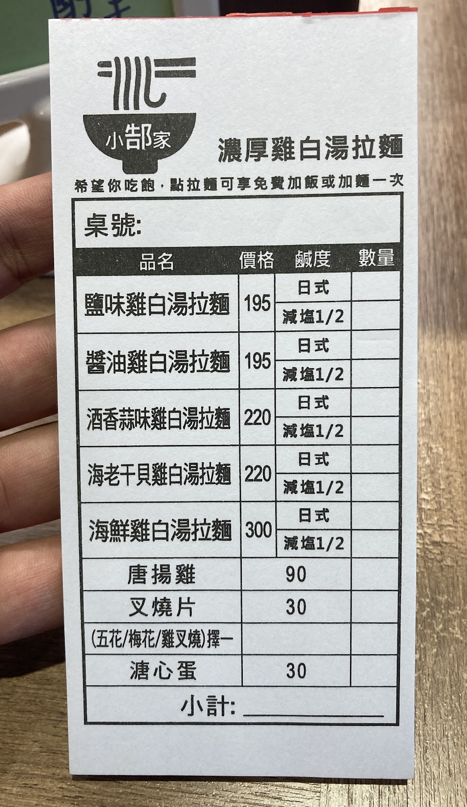 非常日式風格的拉麵,湯頭濃郁香醇、食材新鮮美味,店內小而巧12個座位,乾淨整潔無油煙味,有種來到日本吃拉麵的感覺,來的時候略等一下,自己先寫上候位內用人數,等候中可先點餐,等老闆出來叫號畫號進去用餐;有冰水自取,湯頭本身就像日式拉麵的特鹹湯頭,日本拉麵是不喝湯的,這菜單中貼心設計可選日式或減鹽唷,本身愛細麵條,吃到細麵的軟度剛剛好的口感,吃完有免費加麵或飯唷,有點半自助,吃完自行將餐盤碗遞上餐檯上,老闆用心清潔消毒,講究衛生,值得推薦分享的衛生又美味的拉麵店