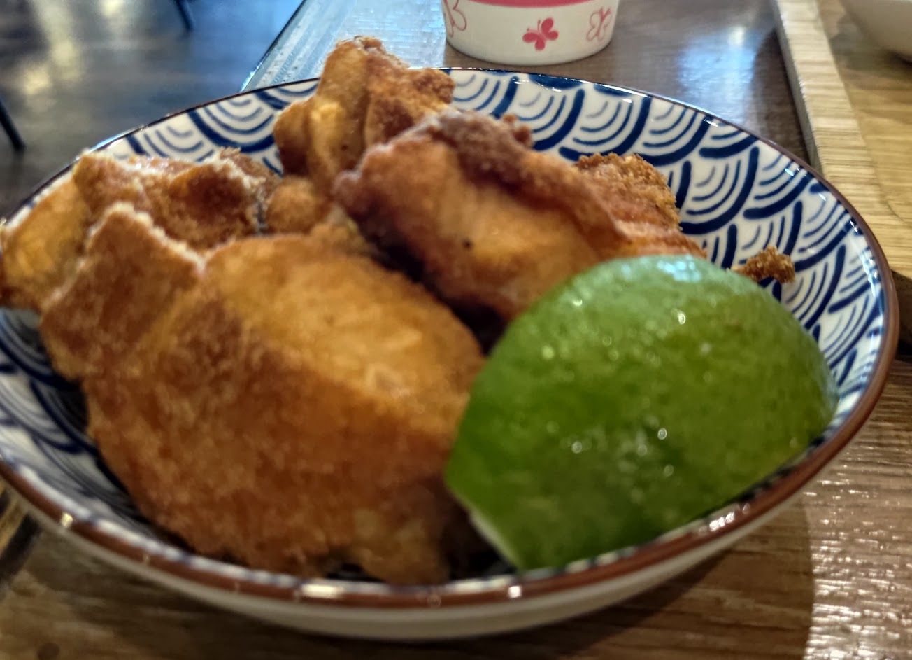 唐揚雞,表面炸衣非常薄脆,淋上附贈一小瓣檸檬,內裏的雞肉鹹香,一口咬下會有肉汁和雞皮油脂流出來,非常滿足的小菜!