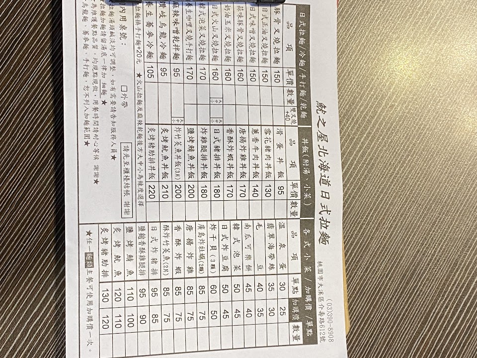 湯頭鮮美濃郁 品項多種 麵條Q彈 價格合理 路邊可停車 服務 內用 餐點類型 晚餐 平均每人消費金額 $1-200 餐點:5 服務:5 氣氛:5 建議的餐點 北海道豚骨拉麵 蔥香牛肉丼飯 唐揚炸雞 炸豆腐