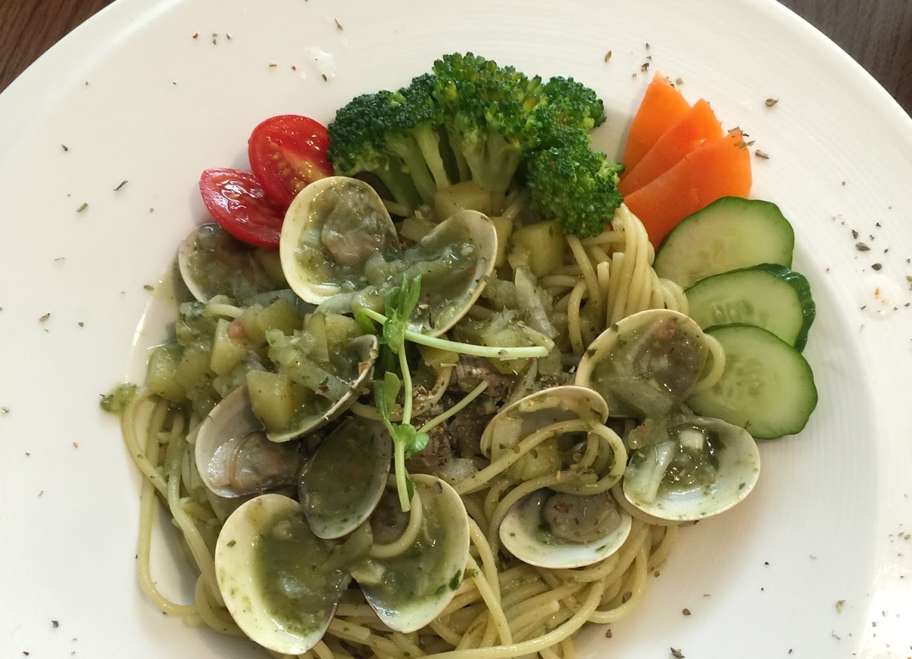 服務很親切,起先店裡客滿,在店外等候期間店家特地拿電風扇出來,非常貼心。 用餐每人低消120元!但是飲品多數80元,覺得有些難湊(並非希望飲品漲價?) 義大利麵很有嚼勁,份量也夠。泰式微辣好吃,但是醬較稠,吃到後面會膩。 …