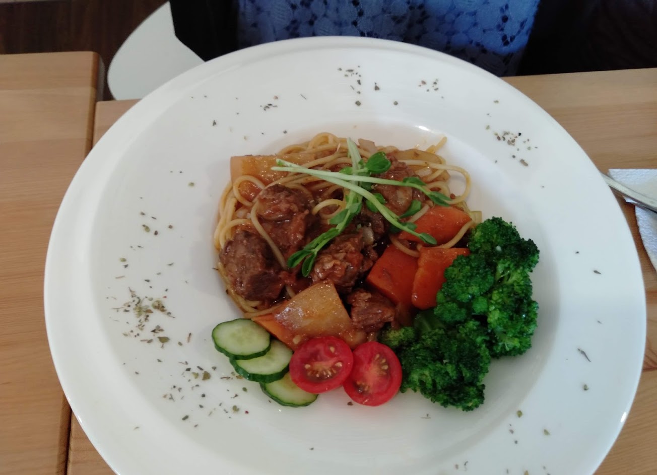 菜色擺盤美味添加健康時蔬,份量豐富! 環境整齊,吧檯設計還讓我可以享用一邊看著老街的人來人往~~~