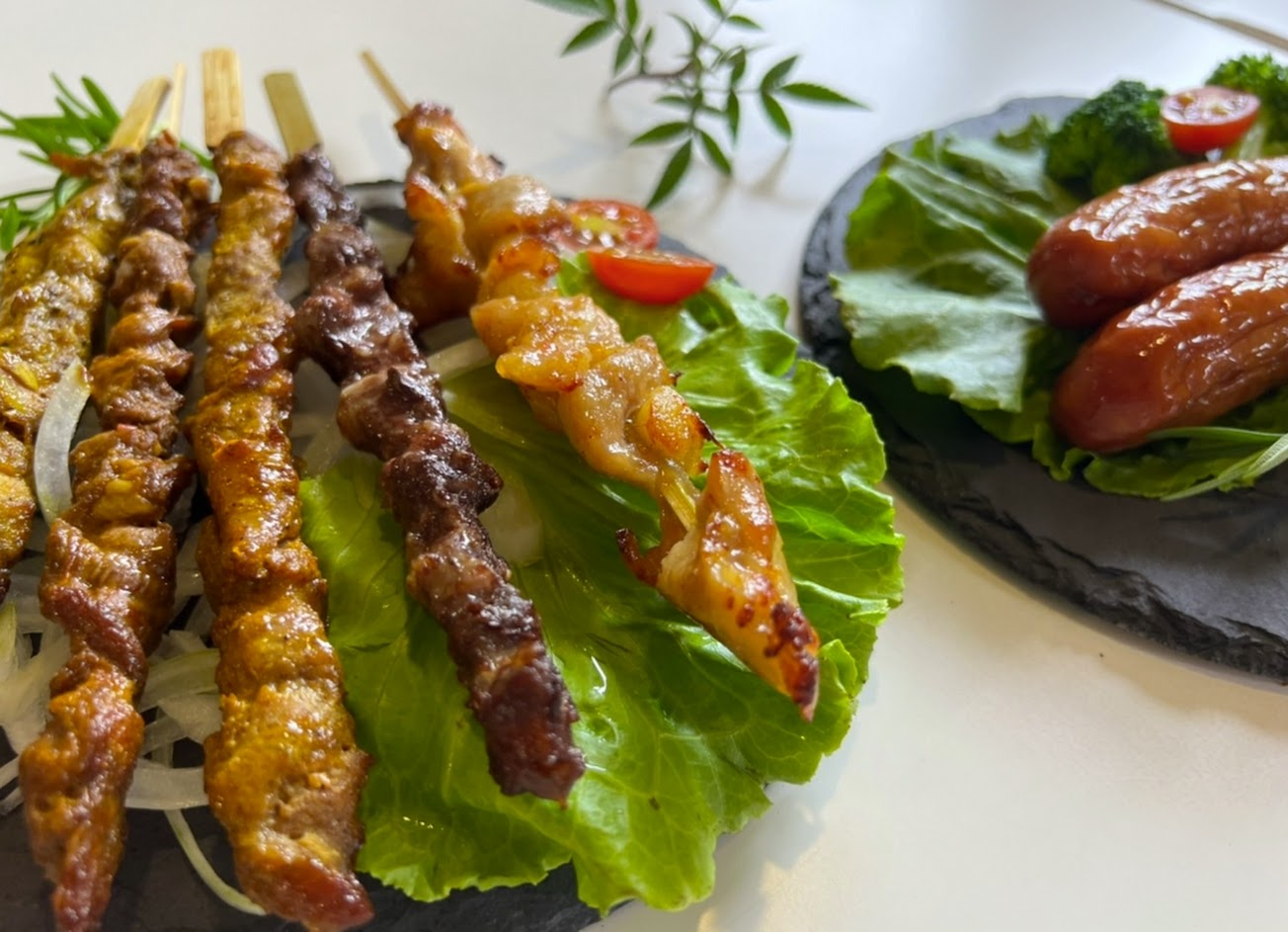 我們點的是:綜合串燒,有雞牛豬羊肉另外再點德國帶骨香腸 ,真的好好吃? 老闆說下午後才有開賣 …