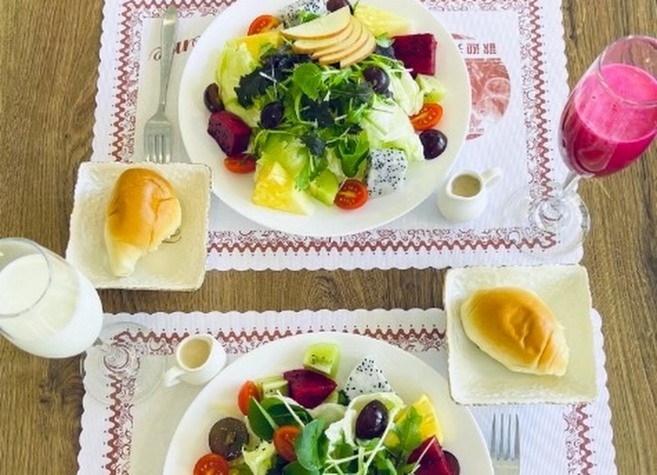 早餐吃這樣的綜合水果沙拉搭配小農鮮奶跟鮮榨果汁真的跟他超級健康的!