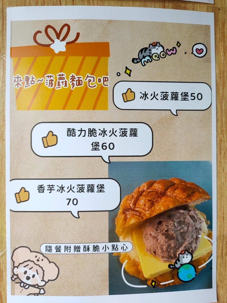 店內的氣氛很不錯,冰火波蘿包的奶油給的很大方,麵包體是屬於有嚼勁型的。芋泥肉鬆蛋餅的芋泥較偏甜,稍微搶走肉鬆的風采,但是搭配一個起司泡菜蛋餅還蠻解膩的? …
