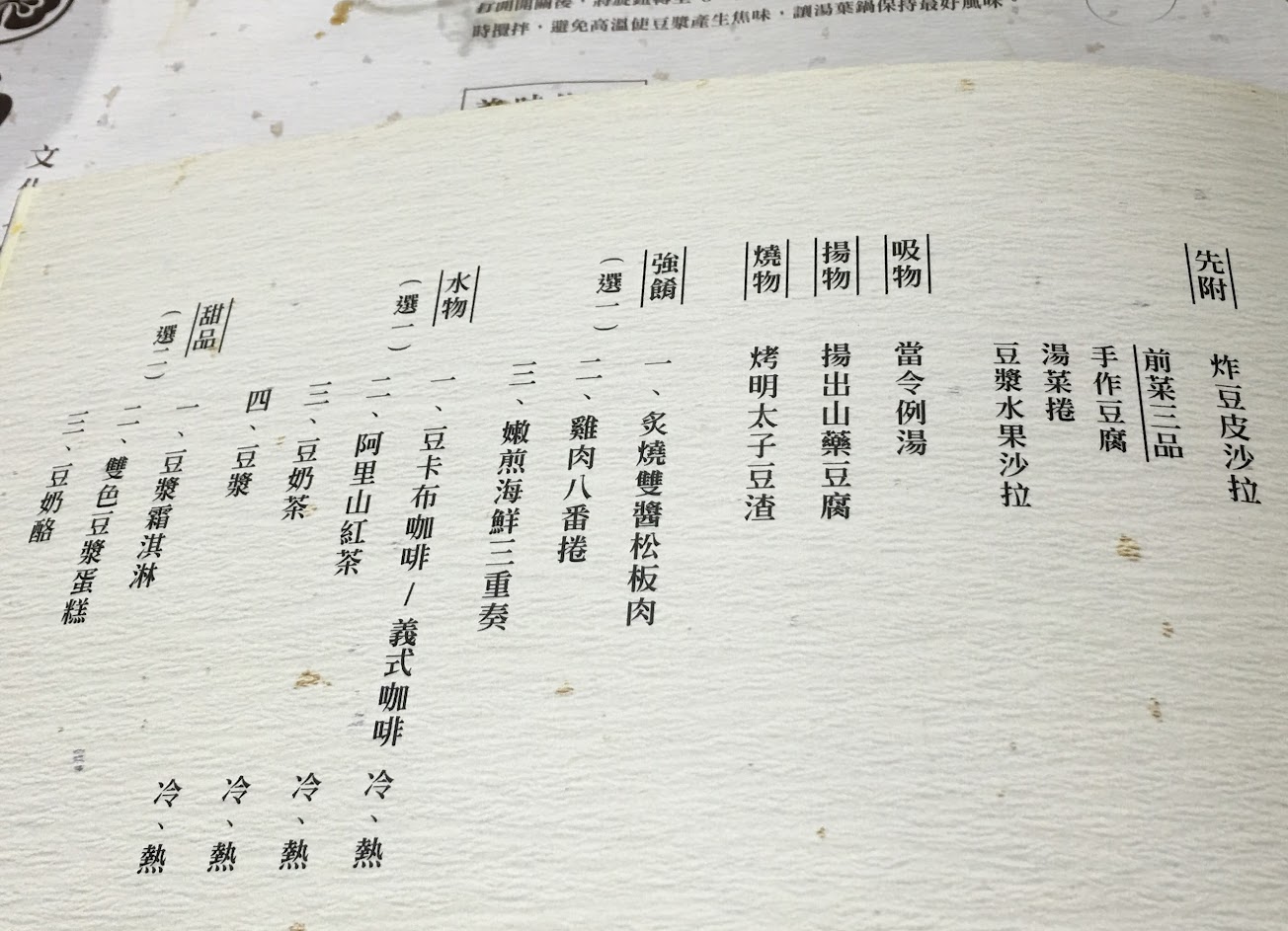 豆類套餐和火鍋豆類料理,僅有400元和600元可選擇,但要一成服務費,有餐後甜點和飲料,雖可單點,但有低消。