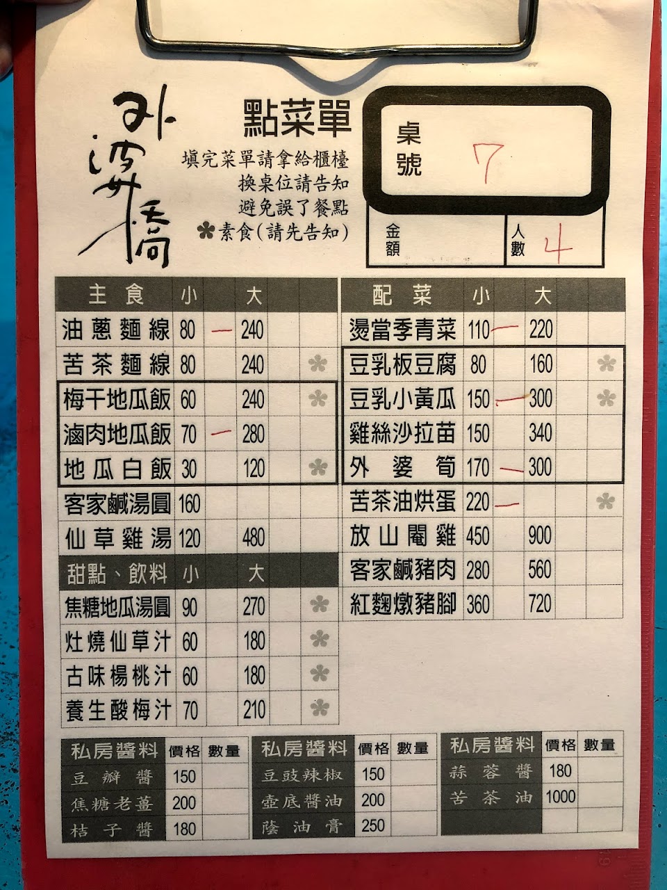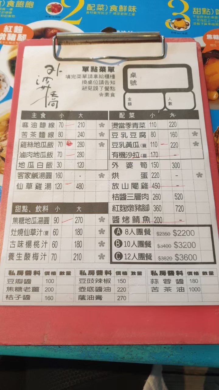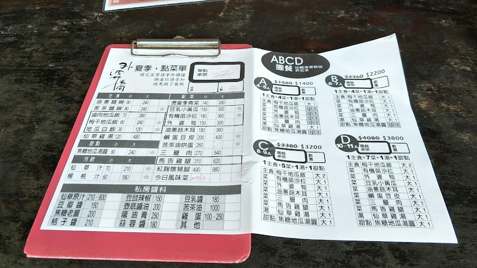 菜單上的選項真的不多,本來想用單點的,但今天剛好沒有滷豬腳,也沒有竹筍,後來就點了一個麵線獨享餐 300 元和一個地瓜飯獨享餐 280 元,菜單上的獨享餐原本都是搭配豬腳的,但今天沒有豬腳,就換成三層肉代替