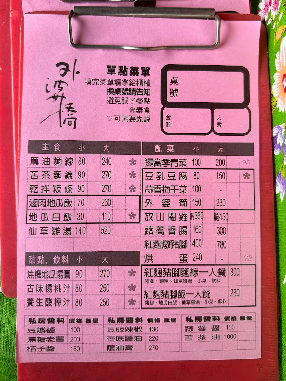 烘蛋, 仙草雞湯, 紅麴燉豬腳, 自製辣椒