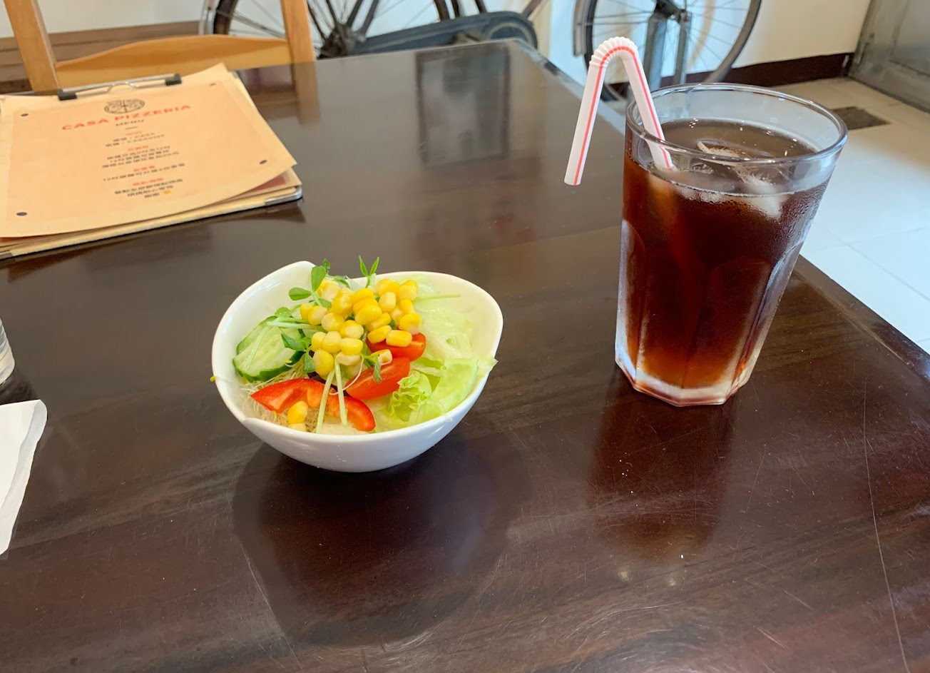店內乾淨、舒適,披薩有二種尺寸。餐具和和水在旁邊的小櫃子,自助拿取。