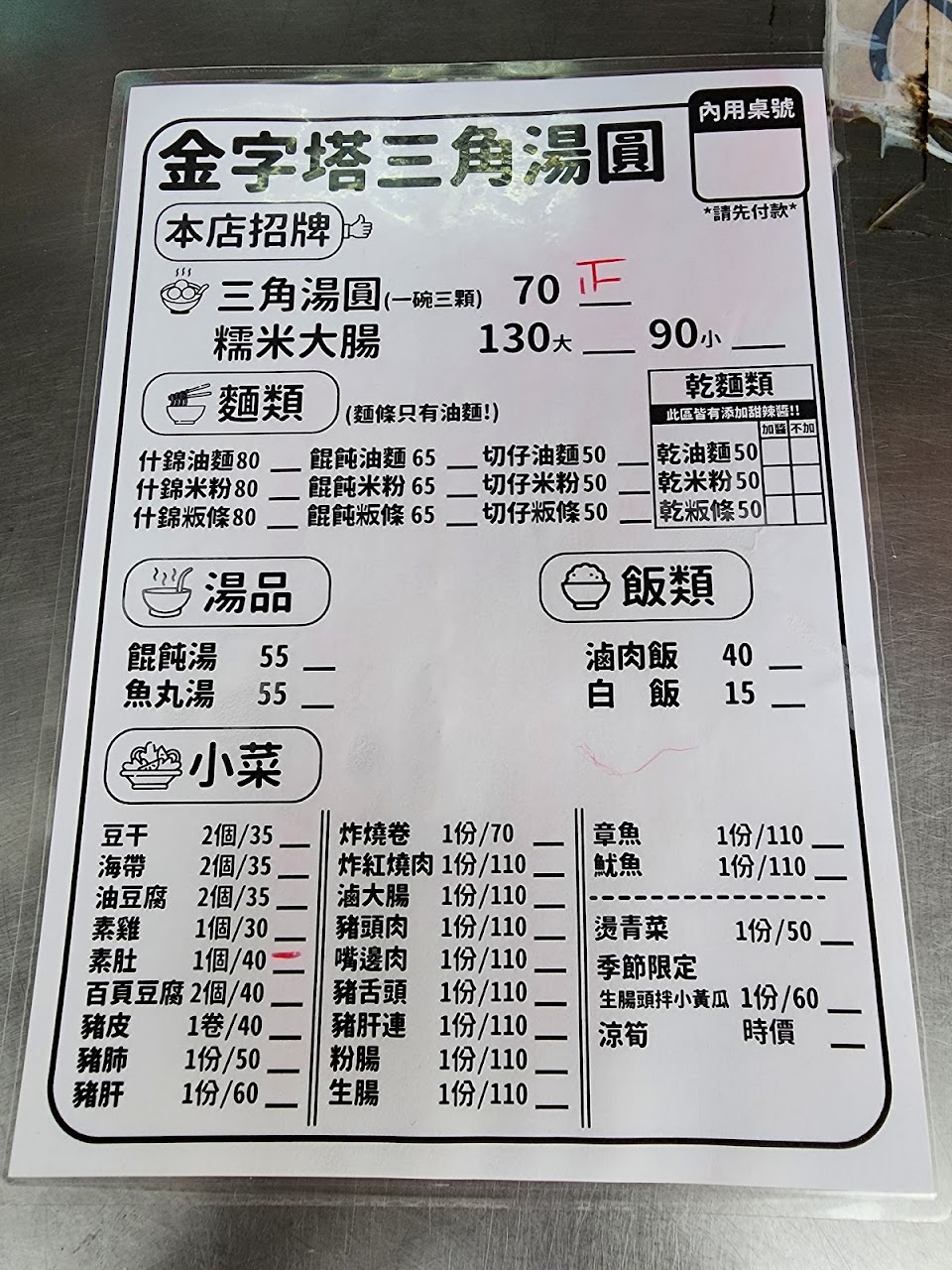 招牌三角湯圓有特色,米腸、小菜口味不錯。