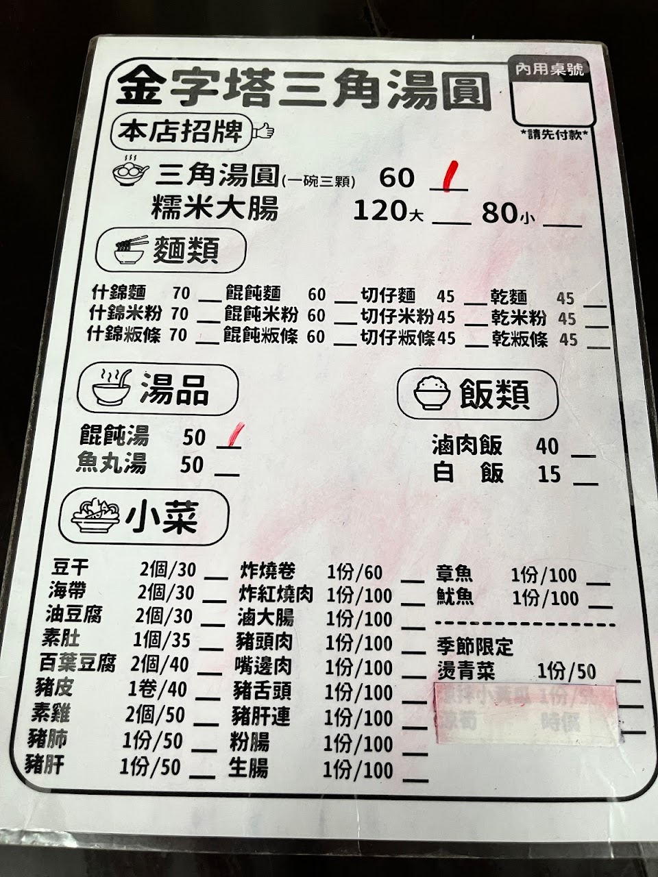因為看很多遊客進來吃,也跟著進來吃,菜單在店旁的柱子上,自行找位子坐,點餐完店門外先結帳。 這次點了三角湯圓與糯米大腸。糯米大腸先上菜,不過糯米都爛爛的,沒有口感,個人不太喜好這種味道。三角湯圓等很久才來,一碗3顆60元,裡面包的是碎豬肉豬肉味很重,雖然店家有加重調味但是沒有壓過去。