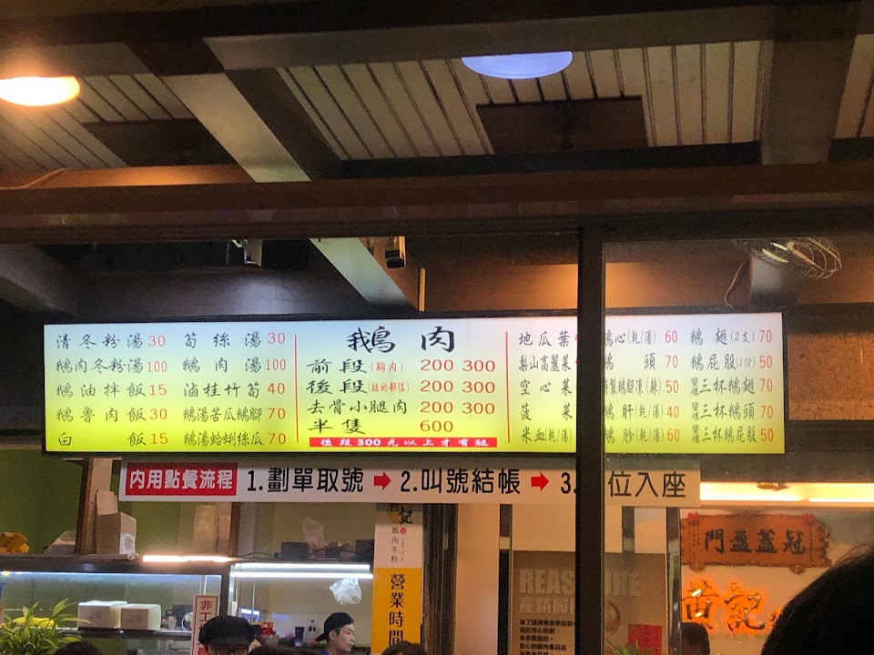 進入黃記鵝肉後,要馬上跟櫃檯拿菜單畫好品項之後排隊,等服務人員叫號、付錢之後才能進入位置上坐。