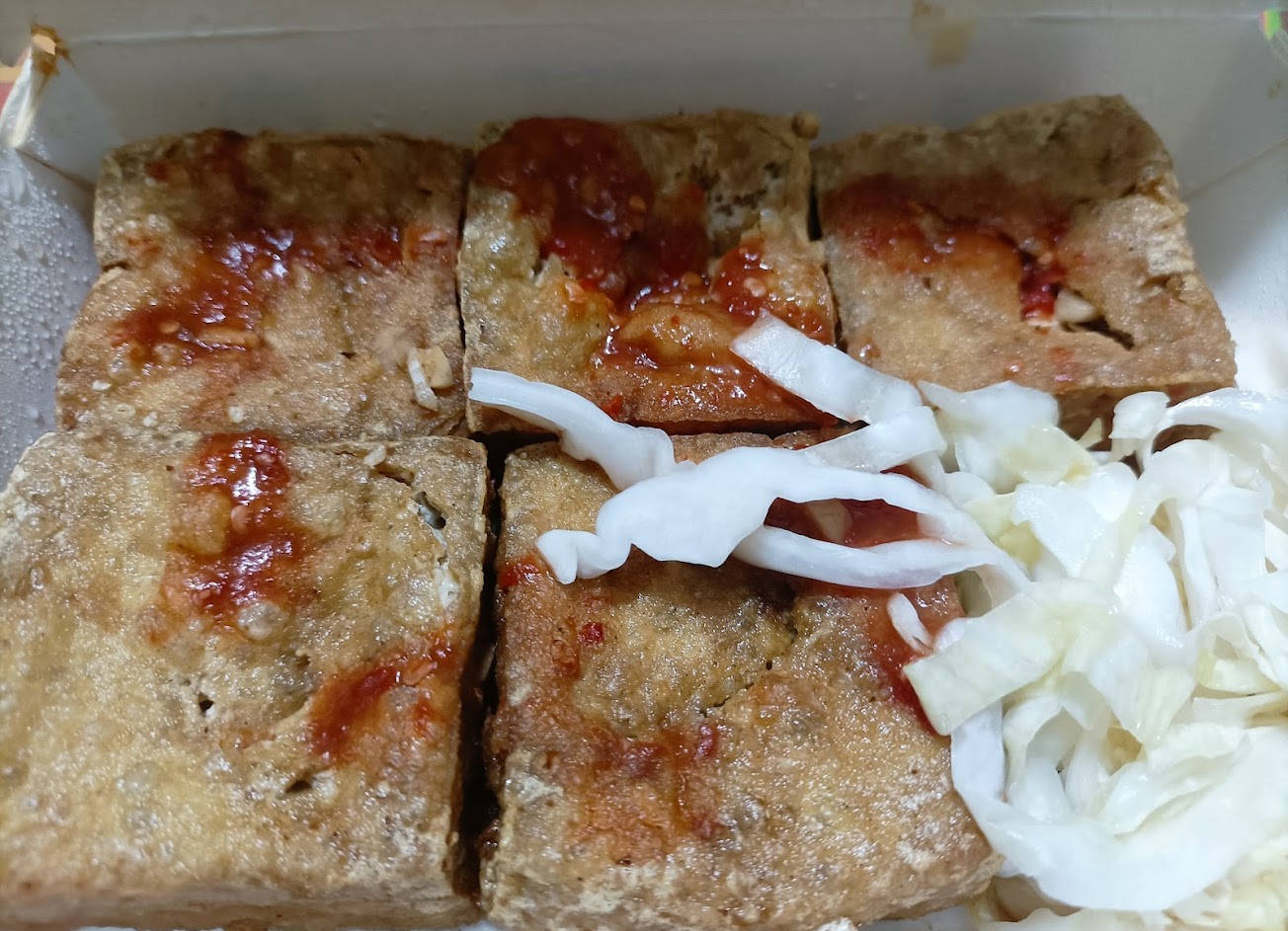 2023.07 臭豆腐,外帶,外皮冷後帶點硬,吃起來還好,沒想像好吃,臭豆腐裡面是軟,不是軟嫰多汁。泡菜真的讓我驚訝,光看就……不太合我的口味。
