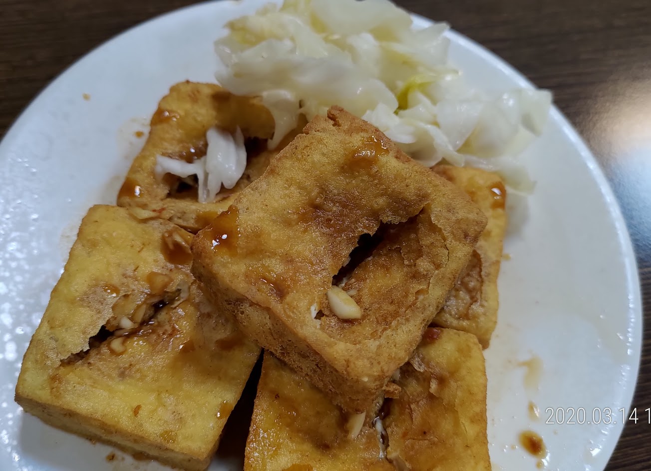 外酥內嫩搭上獨特醬汁口味不錯喔,搭配天然發酵的泡菜很爽口,是逛中華夜市可嚐嚐,豆腐很小塊所以價格算小貴