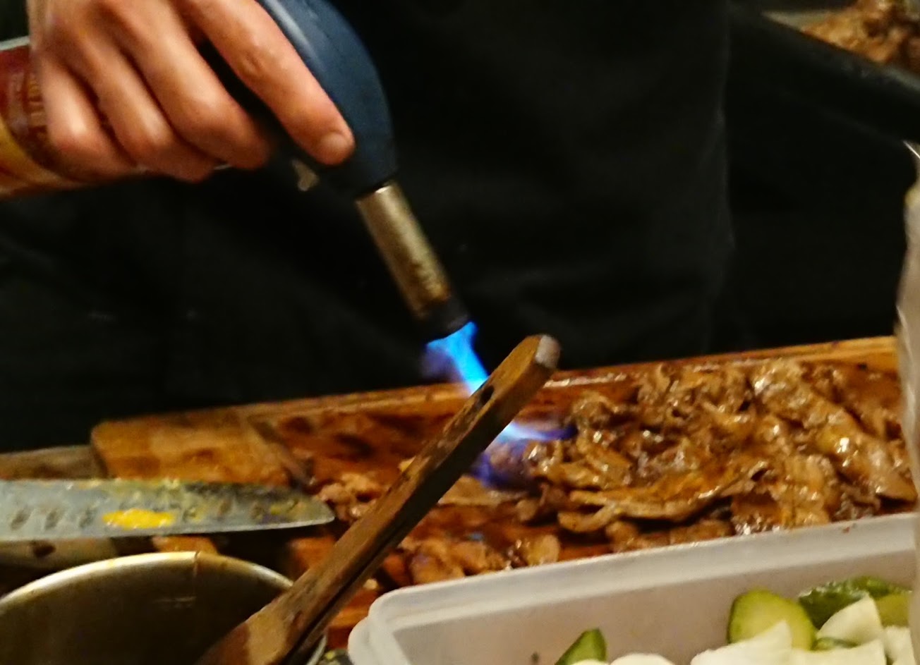 剛好在火車站的附近,五點之前就先到店家等了,所以五點進來,十幾分就吃到了。炙燒牛+唐揚雞很好吃,炙燒牛油花肥而不膩,對唐揚雞的感覺是粉有點多但是上面的美乃滋調醬讓他不會太膩,燒烤雞腿也不錯,唯一美中不足的地方是烤焦地方有點多,味噌湯是有點鹹,但生菜沙拉好吃!然而是在戶外的情況,三不五時就有蚊子飛到湯裡面游泳….
