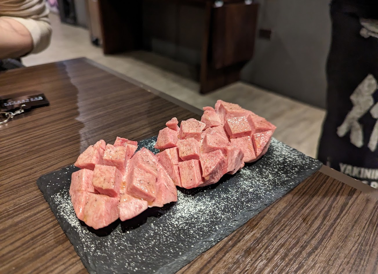 我們兩人吃了快6000元,肉質很棒,只是價格偏貴,我們吃了不少燒肉店,以這樣的份量跟價格覺得有點太高,另外餐廳內的烤肉味太重,抽風系統似乎沒有作用,尤其跟其他的燒肉店比很多走進去根本沒有甚麼油煙味。服務生幫忙烤的技術不錯,但服務態度上有待加強,我們一開始點餐時詢問可否先點了和牛一份,小菜跟海鮮一份,等上菜後看份量再加點,但服務生很堅持要一次點完 不太希望我們之後再加點,一直說這樣不夠,這讓人感受不是很好。吧台沒有可以掛包包的地方,也沒有抽屜可以放東西,只有在入口那有統一可以放置物品的地方,但如果客人有貴重東西不想放那,那就只能抱著包包吃飯,我去過不少餐廳,我想這應該是很簡易的設計。