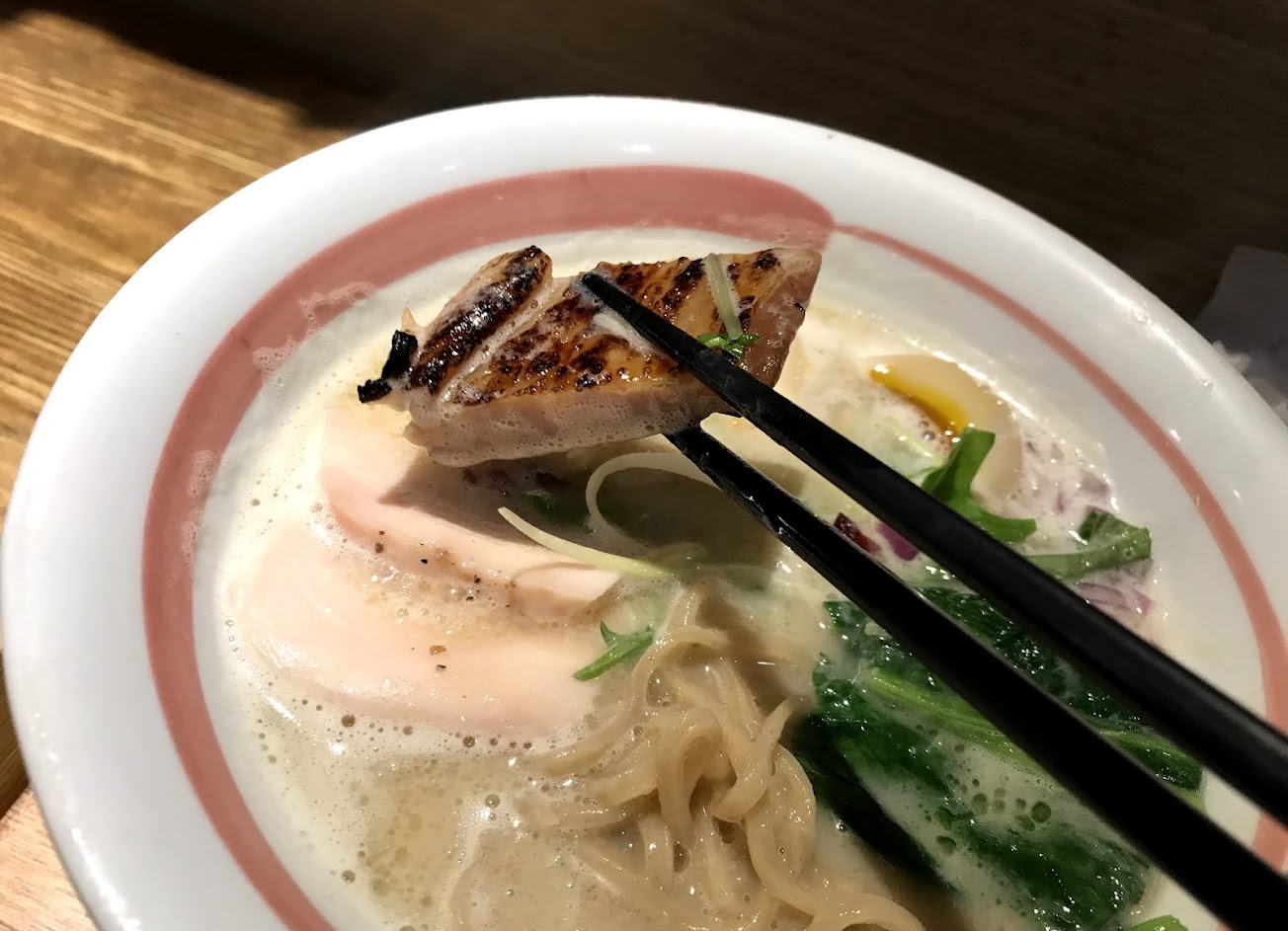我點的是日本口味,麵也是較硬的!另加點溏心蛋,開動前先喝口湯,湯頭確實濃郁,且湯裡還有一些紅洋蔥碎⋯等物,喝起來口感多變,當咬下紅洋蔥碎時反而是帶出甜味,肉有三種,雞肉/叉燒/炙燒過的豬肉,雞肉很讓我驚艷!非常柔軟!叉燒給同行友人,豬肉油脂剛剛好,只可惜第一口邊邊有點炙燒太焦了一點