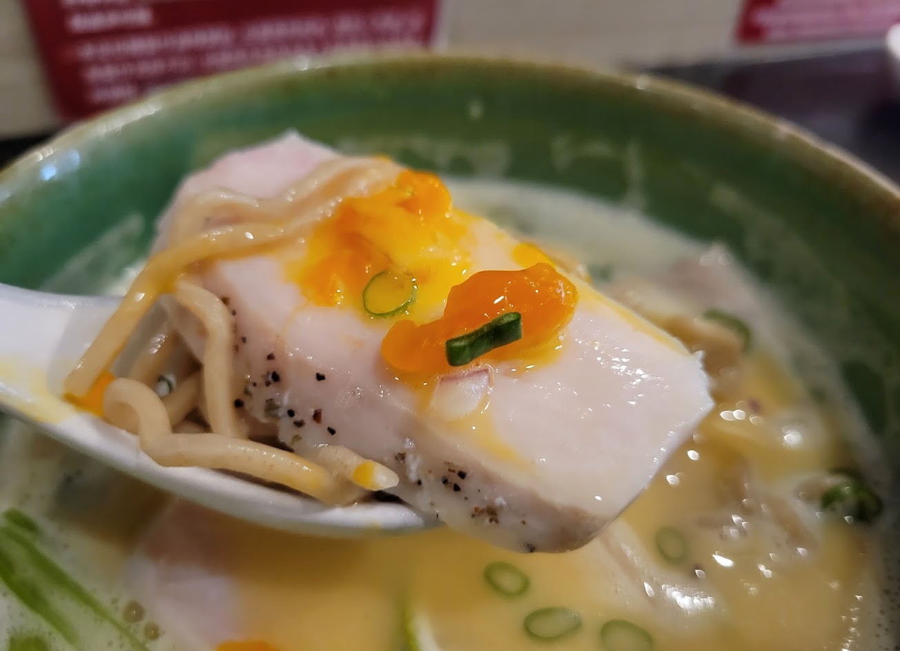 麵條是偏硬但吃起來有點像是沒煮熟的那種感覺,拉麵的湯送上來沒有很燙,是溫溫的那種;另外雞白湯頭口味很濃,但沒有日本拉麵那種稠感,有點可惜。