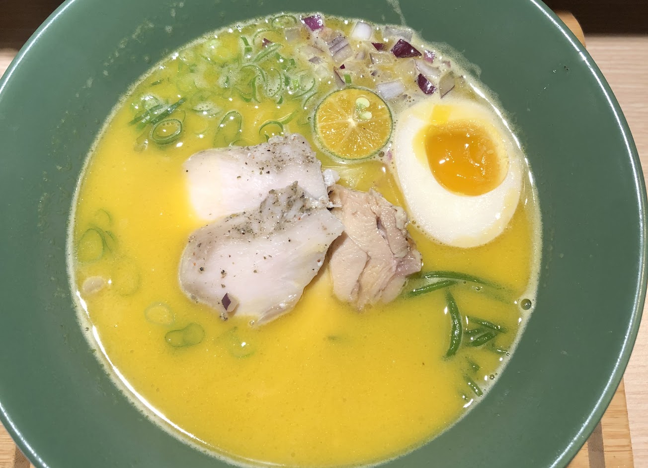 鵝黃色的濃湯味道很濃醇卻不會太厚重 有二片舒肥雞肉&一塊香滷雞腿叉燒 選了博多風細麵 麵條偏軟 配上白蘿蔔絲、青菜&紫洋蔥丁 很完美的增加口感的豐富性 不用加點就有半顆溏心蛋也讓人滿足 餐前還先附上水果&胡麻豆腐 因為我只有點半球麵 店家很貼心的用小碗裝一部份的湯 不然正常呈現的應該會是泡系拉麵 吃得差不多還會來問要不要加麵或加飯