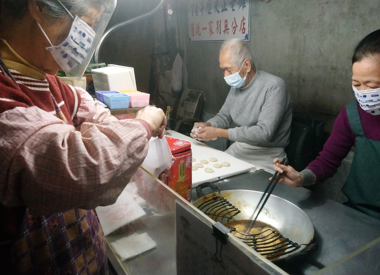 一早就生意很好,週日10點去還算幸運只排兩三個,不過因為現作現點現炸(整個過程極新鮮XD),要稍微等待一下,沒多久我後面就排了一長串人龍。(店家有貼心提醒大家往騎樓裡面排隊比較安全。)