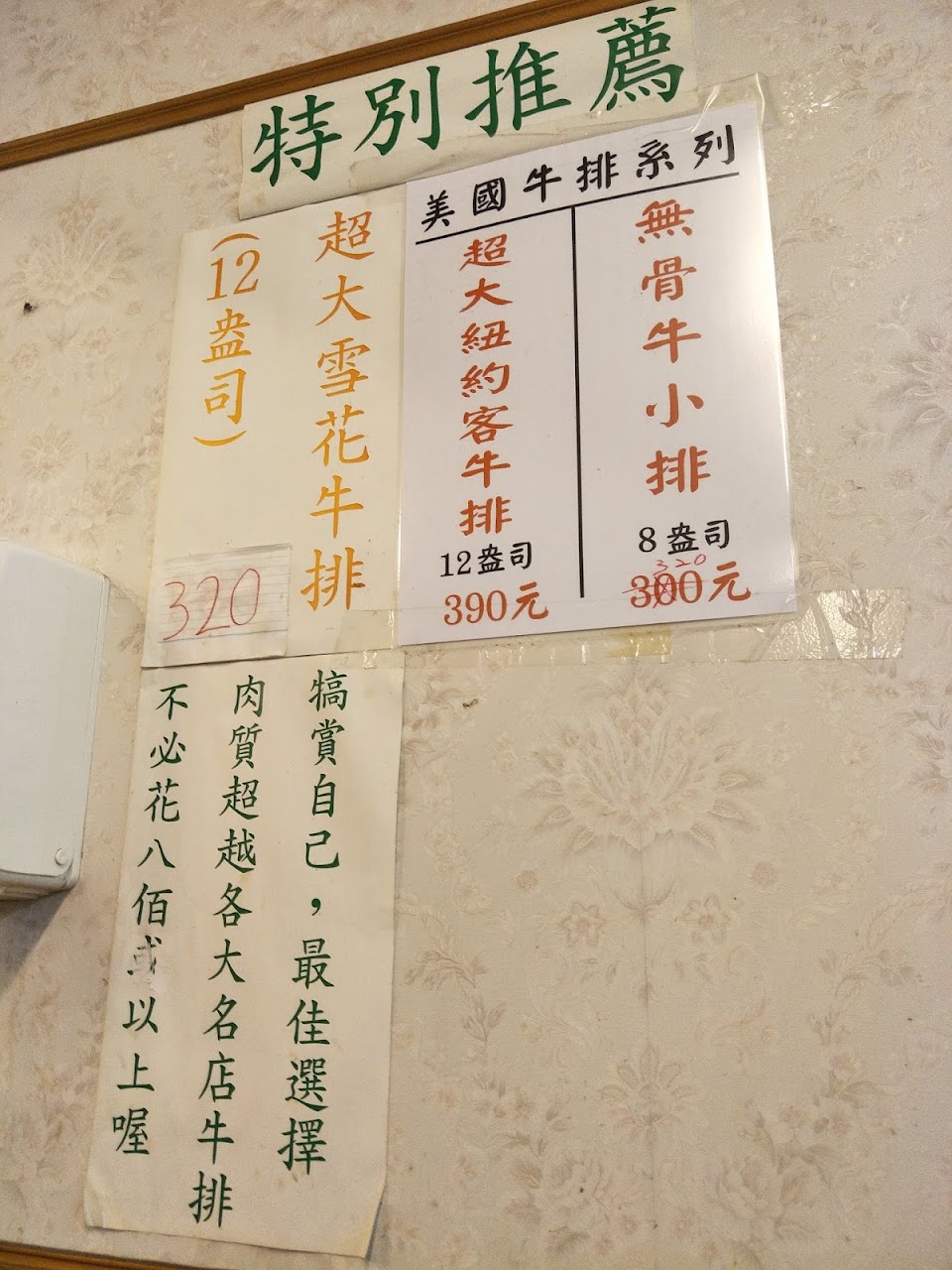我點了超大牛排,吃的很過癮,口味上是我的第二名(我比較不挑嘴),紅茶口味我跟我女兒都很愛,只是腓力牛排,我老公說不合格,老闆說這批味道是不怎麼好,但是也得等這批賣完才能挑選下一批。 平均每人消費金額 $200-400