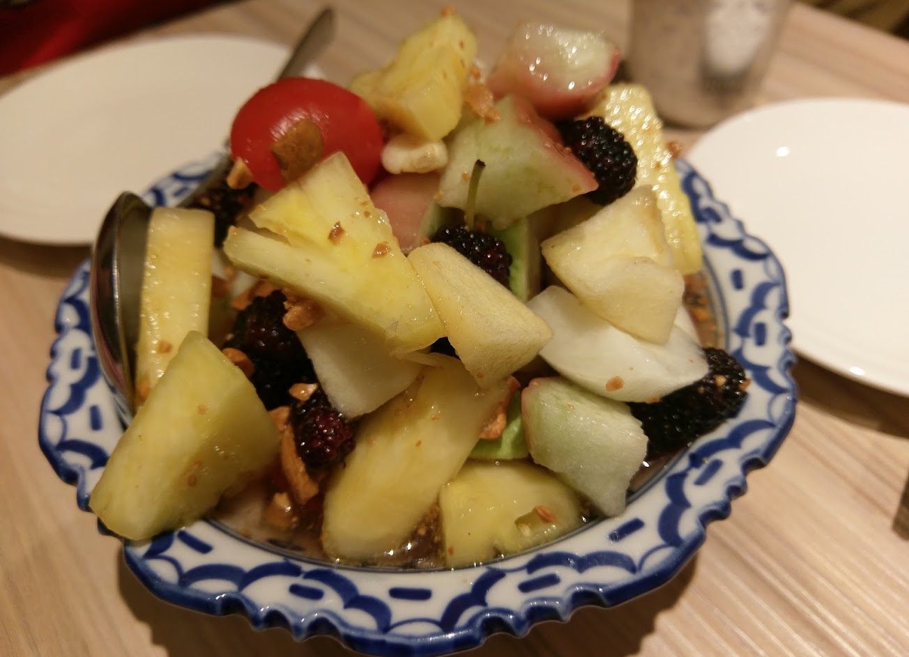 泰式水果沙拉超酷的,一定要試試看有辣椒跟蒜頭的水果沙拉非常好吃,烤松阪豬肉也是大推,香Q嫩!