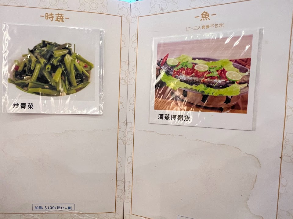 涼拌(泰式水果沙拉/涼拌木瓜絲二選一)+炸物(金錢蝦餅/太式詐雞塊二選一)+咖哩(娘惹咖哩)+肉類(烤松阪豬/打拋豬肉二選一)+時蔬+湯品(香茅海鮮湯/清香酸辣海鮮湯二選一)