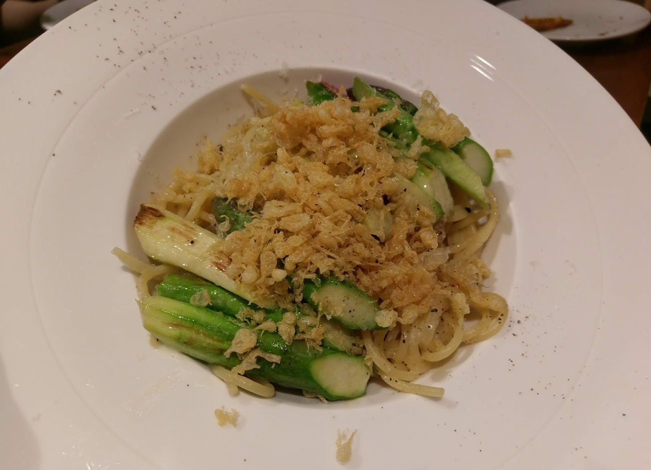 至於主菜我們點了兩道「蒜味雞汁義大利麵」和「板煎櫻桃鴨胸」,招牌鴨胸肉一點也不柴不腥,配上烤節瓜清爽好吃!至於我點的雞汁義大利麵蒜味十足,白蝦給豪氣是好吃的義大麵,但有個缺點,不知道是因為擺盤還是因為雞汁加上橄欖油的關係,在吃完麵之後,剩下的配料都沉在油膩膩的盤底,讓人實在很難把他們全部吃完,甚是可惜啊!
