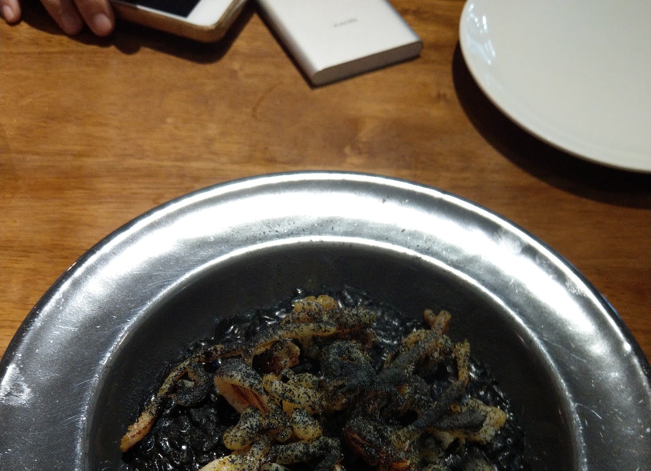墨魚燉飯搭配了柳葉魚,吃到後段偏膩;蒜味白蝦義大利麵較為討喜。服務親切到位,價位合理。