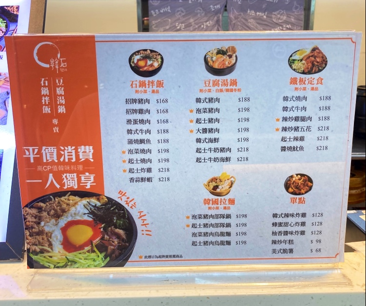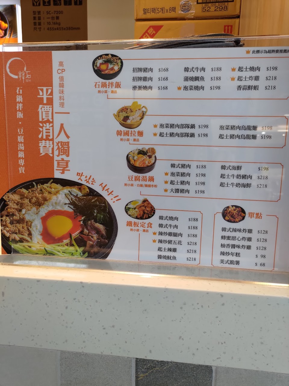 從松竹站坐火車回台中站,六點多剛好吃飯時間,就順便到樓下逛一逛找一間來呷晚餐,有點久沒吃到石鍋拌飯,價格也看了一下都落在168~218元,還蠻平價就點了一份石鍋拌飯來吃,等待約10分鐘,如果有的餐點比較需要久等,店員也會告知。