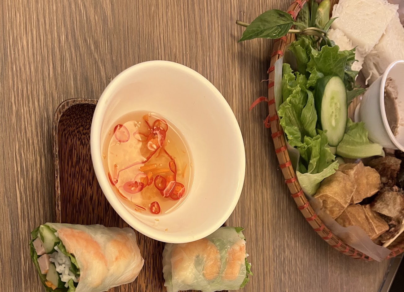 食物》 ✓牛肉米線,搭配附上的九層塔與檸檬角,湯頭順口,可以喝完,牛肉感覺略顯發柴,米粉表現一般,下次會想嚐試牛肉河粉。 ✓米線拼盤小,有炸豆腐,微滷豬腳肉切片,小腸,生菜,九層塔,乾米線切塊,檸檬角搭配一小碗蝦醬,主食米線與所有配料都是無調味的,沾著蝦醬吃,蝦醬很鹹味道很重,擺盤很有越南風。 ✓鮮蝦春捲涼拌,越式春卷皮半透明,可看到包在裡面的食材很美,內有生菜,鮮蝦,米線,小黃瓜,火腿條,沾著附上的魚露吃,味道口感完美,有飽足感,是我吃過最好吃的越南春捲了! ✓店內菜單上還有特色菜,鴨仔蛋,有勇氣者可以挑戰嚐試,機票錢都省了!