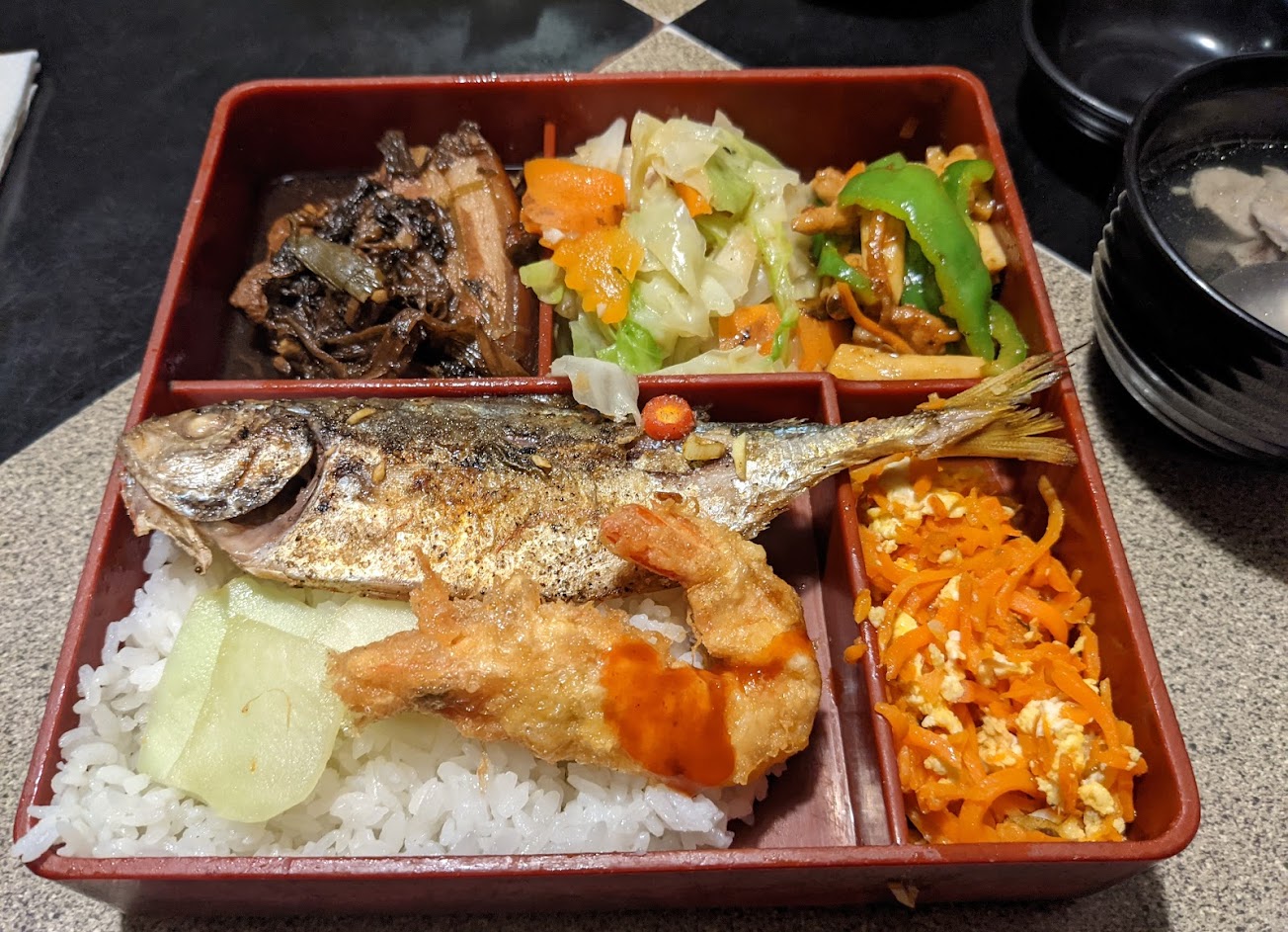客氣的老闆娘強力推薦自家便當 結果被請吃了豐盛的飯菜: 糯米椒炒小魚豆干 菜脯 香煎魚、雞肉 排骨牛蒡湯 每個看似簡單的菜色都又香又嫩 聽說也是配合很久的老師傅所做 甚至有些客人也是過來專程吃飯菜的 絕對要來吃飯!!真的好美味