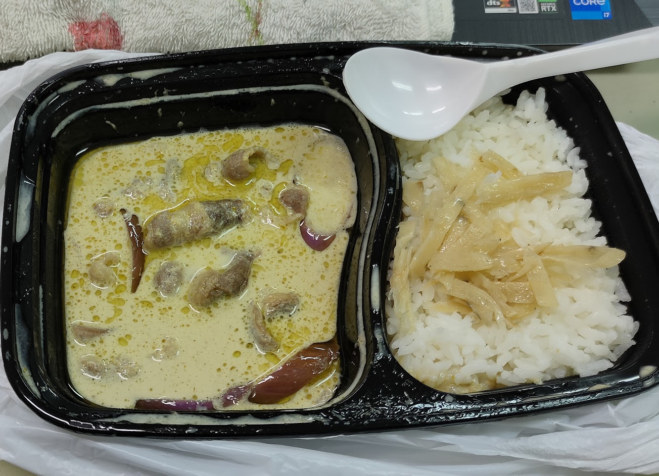 在公司訂Uber Eats外送,公司離店850M左右。送到時發現份量很足,別看照片飯的面積好像不大,這便當盒很深,我還外加白飯。最重要的牛肉應該是這份現做的,口感軟嫩非常好吃。綠咖哩超好吃,辣度適中,連想吃辣又不太感吃辣的人都可以嘗試看看喔。另外你們的豬排可以單點嗎?外送平台上沒看到耶。