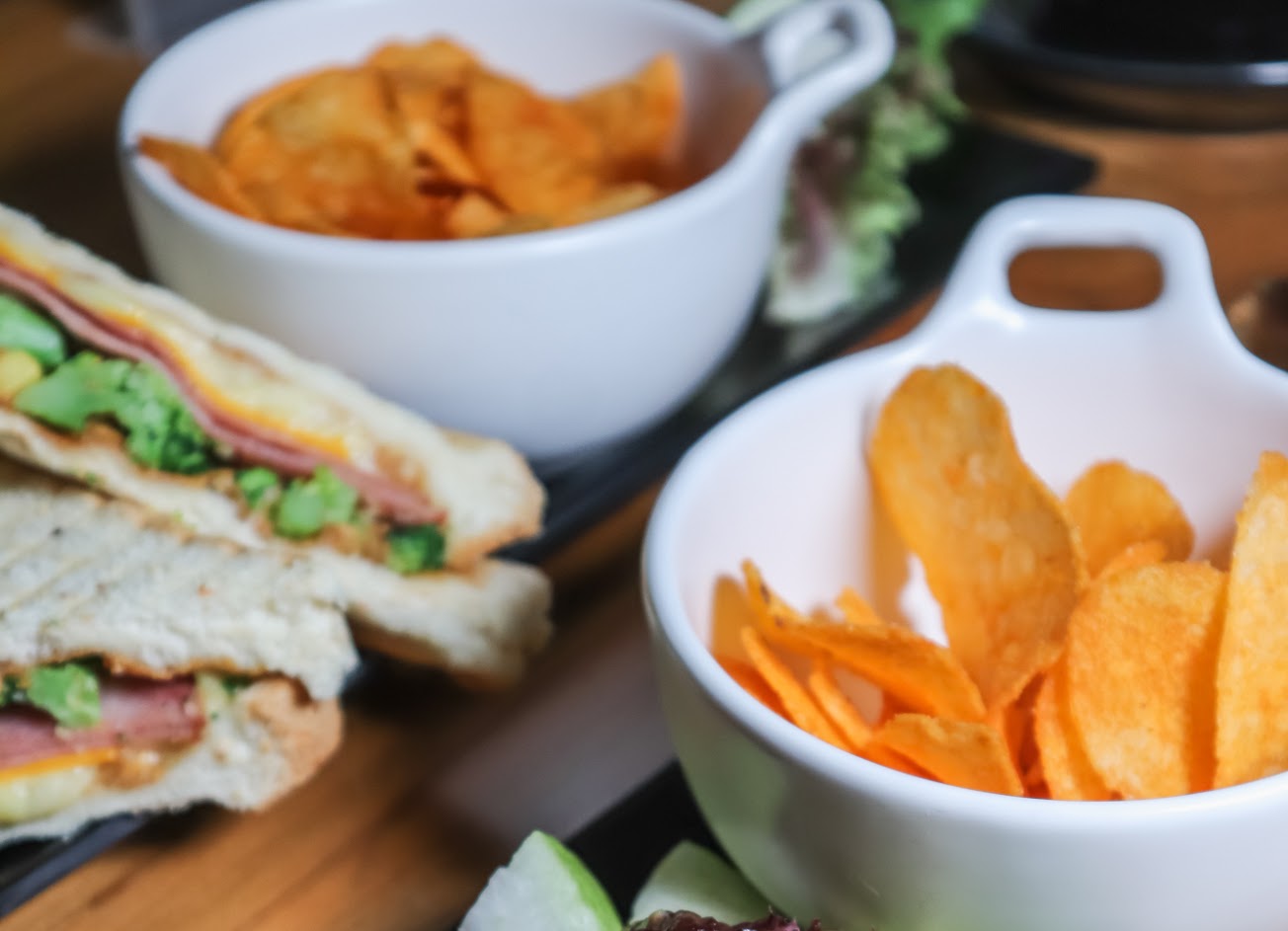 #沙沙培根古巴三明治 ɴᴛ.180 (附薯片/飲料/小沙拉) 一口咬下,三明治吐司的邊角烤的微脆,整體吐司味道也很好吃,咀嚼後可以吃到明顯的花生醬味,增加鹹甜口感,搭配了經典火腿和起司的味道。
