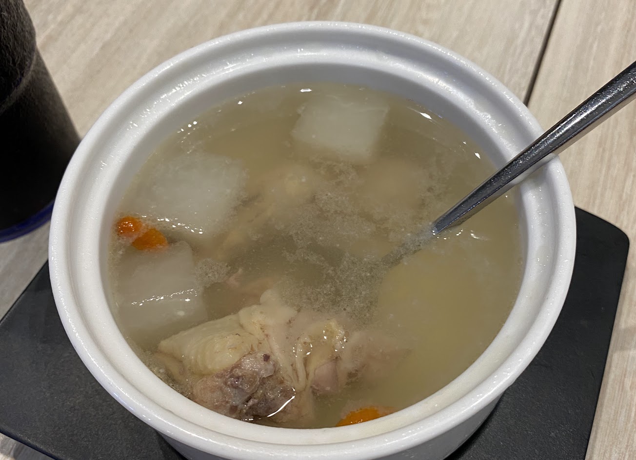 2、先上來的湯,不說還以為是便當店的湯,裡面雞肉是帶有骨頭的碎肉,不說還以為是燒臘店的湯…..而且更沒誠意,傻眼