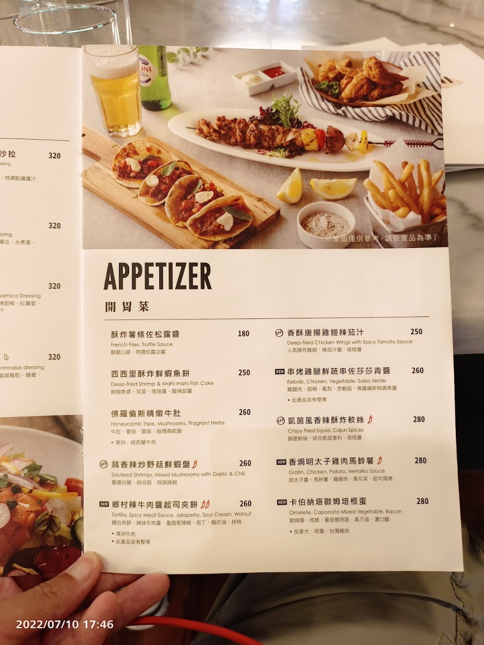前往時適逢假日,單點主餐無法升級套餐,均需一一單點,因此選擇雙人套餐再加點燒烤五品。蒜香辣炒鮮蝦野菇盤很香,蝦的品質也不錯,義大利麵和燉飯都是我們喜歡的偏硬口感,牛肝菌起司燉飯還推了起司車來現拌整個很浮誇,拌完再撒上現磨起司,以這樣性質的餐廳來說竟有這項服務相當超值,起司味很濃郁,喜歡起司的話相當推薦。但明太子中捲麵就相對普通,中捲都是觸角,而且醬汁水份較多不太容易沾附,個人較不喜歡。此外桌距和桌面都小,用餐起來不是太舒服。