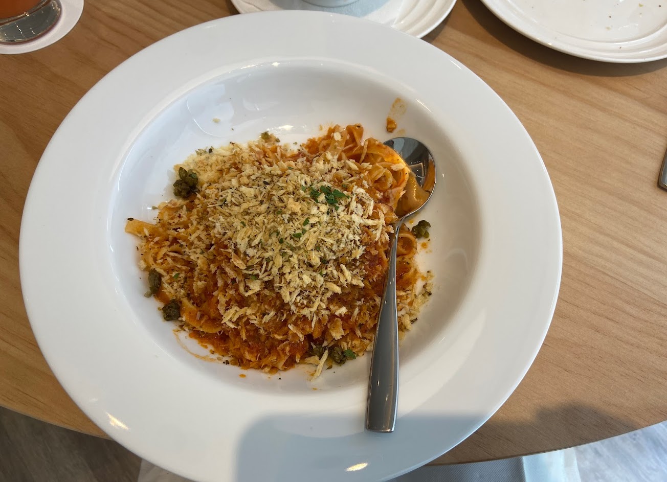 「鯷魚義大利麵」開幕期間有半價優惠,可惜口味上個人吃不慣(主要是義大利麵上面撒的麵包屑覺得不搭,導致整體餐點吃不習慣,感受普通。)