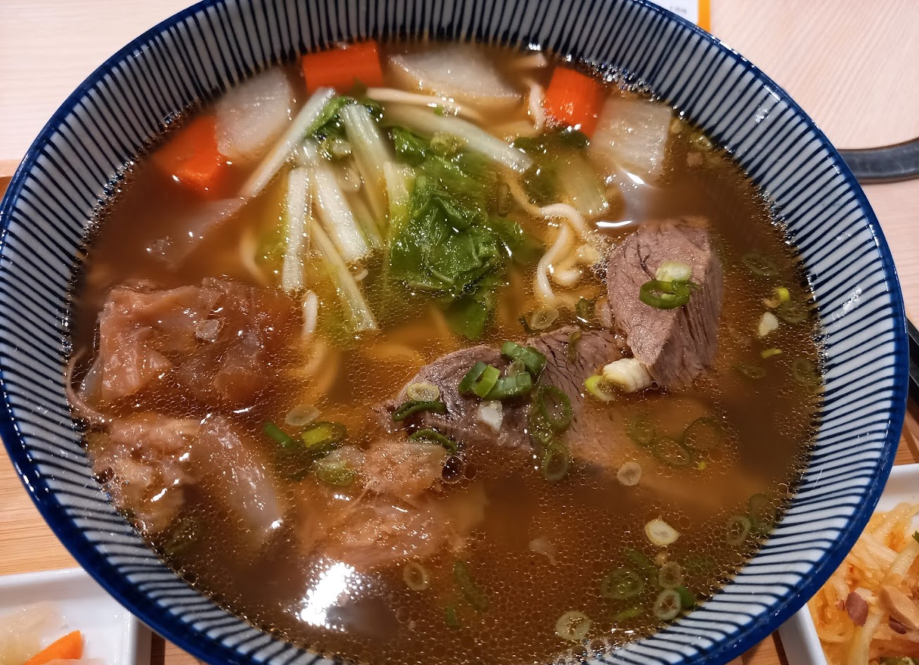 服務員十分親切,可以感受熱忱的介紹產品,未吃先加分。 本來只是路過,被氣氛吸引進來,因為只有一人,只點了店員推薦的牛腱+牛筋,循例加麵。 清燉湯頭甘甜,麵與肉中規中矩,這個價位加麵不加價,還附小菜兩碟,太感人了了了~ 自助區無限自取,酸菜口味與一般常見略異,一時興起,與辣醬混搭,真真有驚豔到。