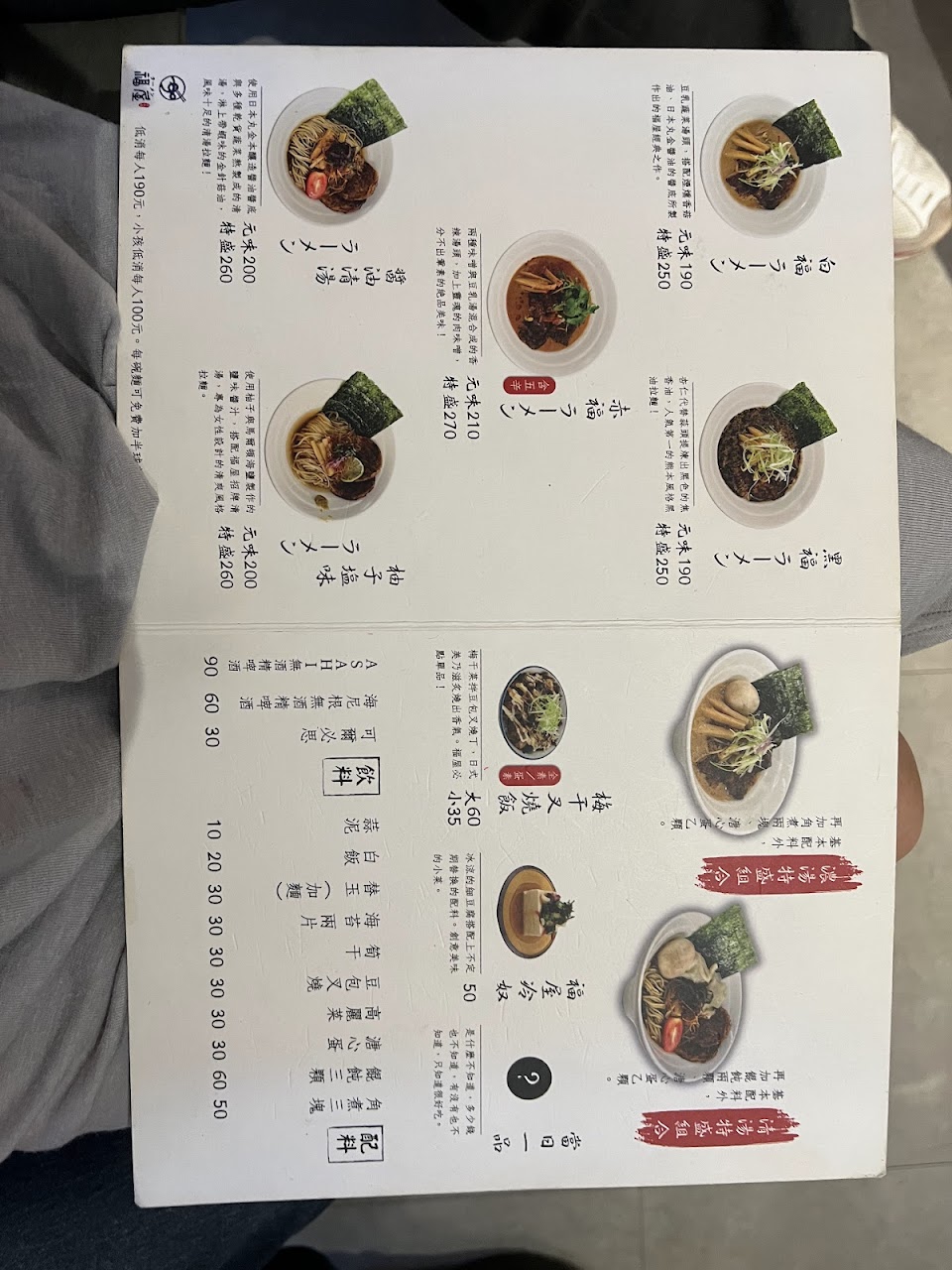 第一次吃福屋,昨天帶著媽媽一起去台中辦事就想一定要去吃一次,終於吃到了,店家很友善讓我踩線在休息之前吃到我想吃的拉麵,耐心介紹。我點的是黑福加角煮湯頭濃郁,但下次要試試味道在濃郁的版本,還要來吃看看他的割包。一日限定媽媽說煎餃很好吃? 服務 內用 餐點類型 晚餐 平均每人消費金額 $1-200