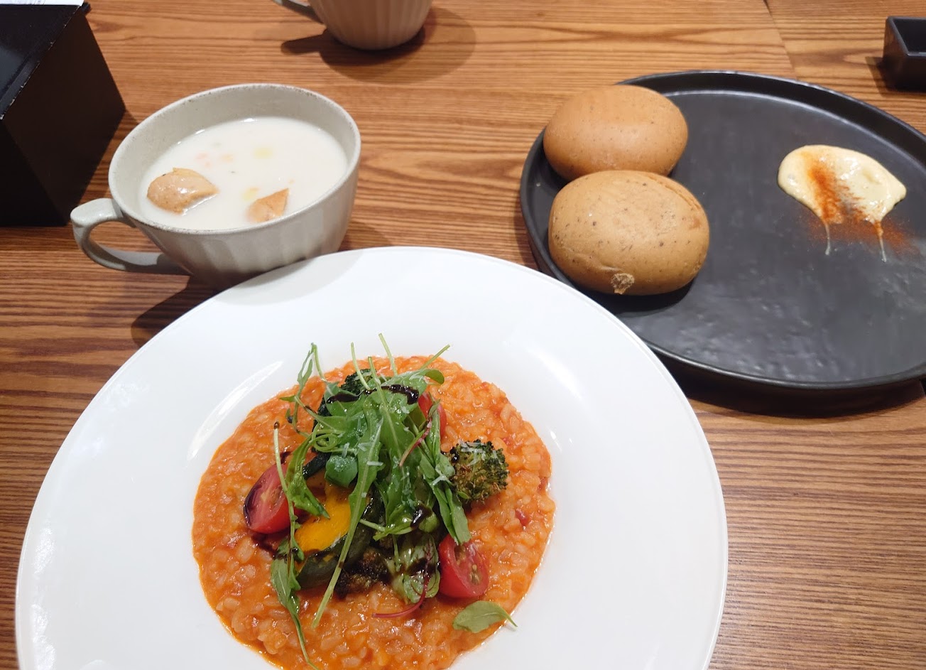 濃湯好喝,餐點田園時蔬茄汁燉飯口味好吃 餐點:5 服務:5 氣氛:4